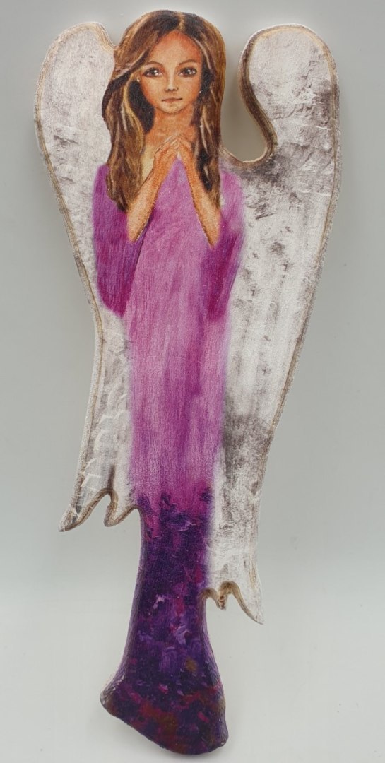 Anioł drewniany malowany lawendowy 50 cm